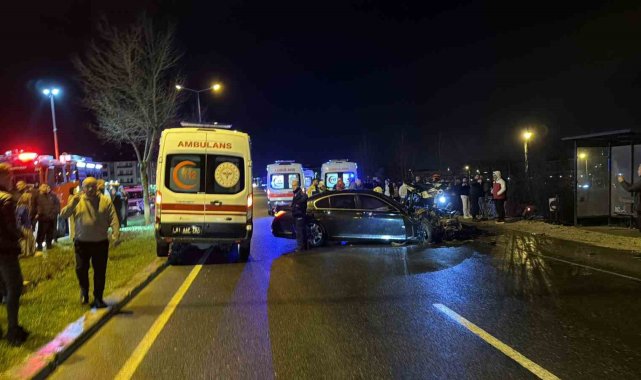 Düzce'de lüks otomobilin halk otobüsüne çarptığı kaza güvenlik kamerasına yansırken, bölgede bulunan restorandaki müşteriler ve çalışanlar yardımına koştukları kazazedelere ilk müdahaleyi yaptı.