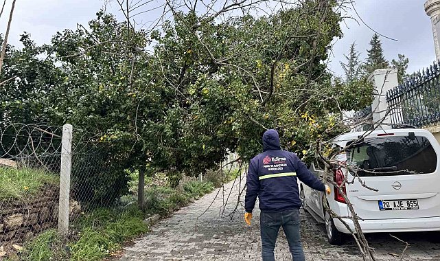 Edirne'de etkili olan fırtına nedeniyle kökünden sökülen ağaç park halindeki aracın üzerine devrildi.Edirne'de etkili olan fırtına hayatı olumsuz etkiliyor. Saatteki hızı 60 kilometreyi bulan rüzgar nedeniyle kökünden sökülen bir ağaç, park halindeki otomobilin üzerine devrildi. Bir başka ağaç da gövdesinden kırılarak yola devrildi. Belediye ekipleri devrilen ağaçları keserek yoldan kaldırdı.