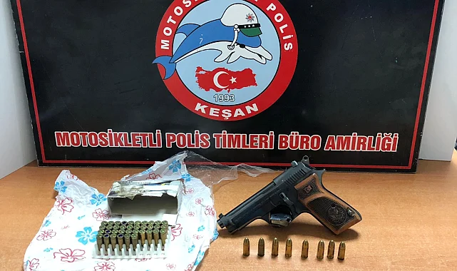 Edirne'de Keşan İlçe Emniyet Müdürlüğü'ne bağlı ekipler halkın güvenliği için denetimlerini aralıksız sürdürürken, şüphe üzerine durdurdukları araçta ruhsatsız tabanca ile 44 mermi ele geçirdi.