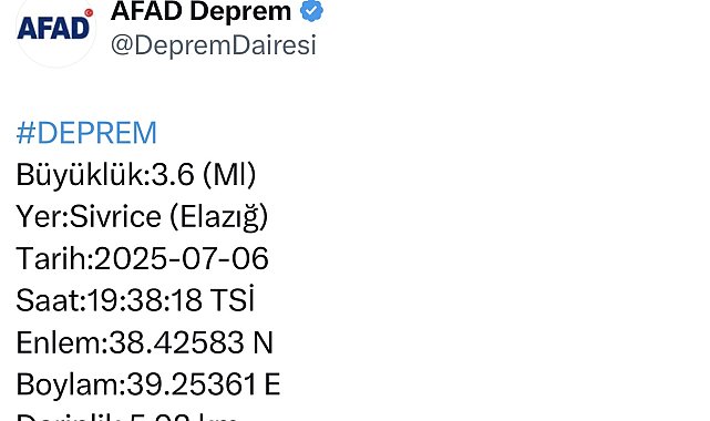 Merkez üssü Elazığ'ın Sivrice ilçesi olan 3.6 büyüklüğünde deprem meydana geldi.Afet ve Acil Durum Yönetimi Başkanlığı Deprem Dairesi Başkanlığından alınan bilgiye göre, saat 19:38'de merkez üssü Elazığ'ın Sivrice ilçesinde 3.6 büyüklüğünde deprem meydana geldi. Yerin yaklaşık 6 kilometre derinliğinde meydana gelen depremle ilgili olumsuz bir durum yaşanmadığı öğrenildi.