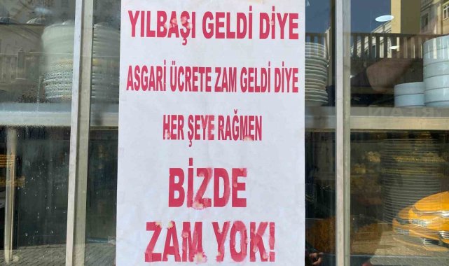 Elazığ'daki bir esnaf dükkanının girişine 'Yılbaşı ve asgari ücrete zam geldi diye her şeye rağmen bizde zam yok' yazısı asarak, zam ve fahiş fiyat uygulayan kesime karşı tavrını korudu.