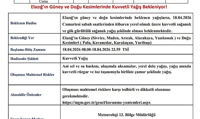 Meteoroloji, Elazığ için kuvvetli yağış uyarısında bulundu.Meteoroloji 13. Bölge Müdürlüğü'nden yapılan açıklamada, "Elazığ'ın güney ve doğu kesimlerinde beklenen yağışların, 18.04.2026 Cumartesi sabah saatlerinden itibaren yerel olmak üzere kuvvetli sağanak ve gök gürültülü sağanak yağış şeklinde olması beklenmektedir. Beklendiği yer Elazığ'ın güney (Sivrice, Maden, Arıcak, Alacakaya, Yazıkonak ) ve doğu kesimleridir ( Palu, Kovancılar, Karakoçan, Yurtbaşı). Oluşması muhtemel riskler; ani sel ve su baskını, ulaşımda aksamalar, yerel dolu yağışı, yağış anında kuvvetli rüzgar ve toz taşınımıyla birlikte çamur şeklinde yağıştır. Oluşması muhtemel risklere karşı tedbirli ve dikkatli olunması gerekmektedir" denildi.