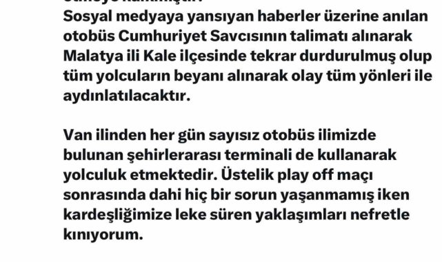 Elazığ Valisi Numan Hatipoğlu, Van otobüsüne yönelik saldırı iddialarıyla ilgili kamuoyunu bilgilendirdi. Olayın sosyal medyada çarpıtıldığını belirten Vali Hatipoğlu, sürecin savcılık talimatıyla detaylı şekilde incelendiğini söyleyerek, "Kardeşliğimize zarar vermek isteyen hiçbir girişime müsaade etmeyeceğiz" ifadelerini kullandı.Van'a ait bir otobüsün taşlı saldırıya uğradığı yönündeki haberler sonrası Elazığ Valisi Numan Hatipoğlu'ndan konuyla ilgili açıklama geldi. Vali Hatipoğlu, sosyal medyada yayılan iddiaların ardından olayın tüm yönleriyle incelendiğini belirterek, asılsız haberlerin iki il arasındaki kardeşliğe zarar veremeyeceğini vurguladı. Vali Hatipoğlu olayla ilgili yaptığı açıklamada, "Van haber sitelerinde bir Van ilimize ait otobüsün taşlı saldırıya uğradığına dair haber ile ilgili olarak kamuoyuna doğru bilgi verilmesi zarureti doğmuştur. Adı geçen firmanın otobüsünün şoförü sadece kasko firmasına ibraz edilmek üzere tutanak tanzimi talebinde bulunmuş ve yoluna devam etmeye kalkmıştır. Sosyal medyaya yansıyan haberler üzerine anılan otobüs cumhuriyet savcısının talimatı alınarak Malatya ili Kale ilçesinde tekrar durdurulmuş olup tüm yolcuların beyanı alınarak olay tüm yönleri ile aydınlatılacaktır. Van ilinden her gün sayısız otobüs ilimizde bulunan şehirlerarası terminali de kullanarak yolculuk etmektedir. Üstelik play off maçı sonrasında dahi hiçbir sorun yaşanmamış iken kardeşliğimize leke süren yaklaşımları nefretle kınıyorum. Olayın takipçisi olacağımın bilinmesini tüm kamuoyuna bildiririm. İki güzide ilimizi hala futboldan dolayı husumetli gibi gösteren bu haberler ne futbolun birleştirici ruhuna ne de illerimiz arasındaki kardeşliğe zarar verecektir. Hiçbir nifak tohumu kardeşliğimize zarar veremeyecektir" dedi.