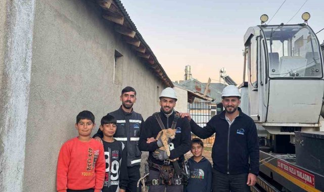 Elektrik direğinde mahsur kalan kediyi ekipler kurtardı