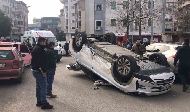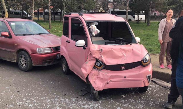 Kaza sonrası kontrolden çıkan elektrikli otomobil, park halindeki elektrikli mini arabaya çarptıktan sonra takla attı.