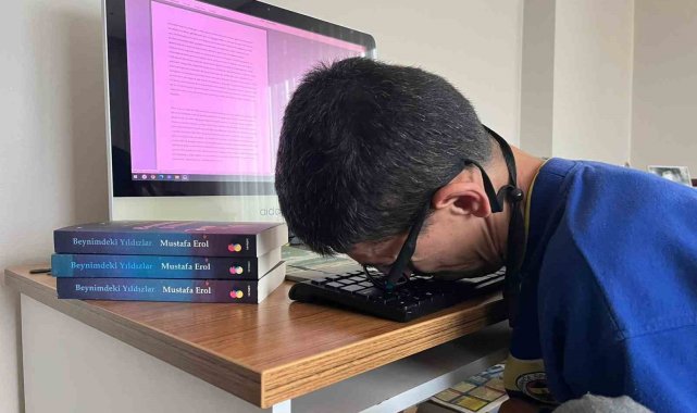 Aydın'ın Efeler ilçesinde, doğumda beyni oksijensiz kaldığı için 'serebral palsi' hastalığı nedeniyle ellerini ve ayaklarını kullanamayan 44 yaşındaki Mustafa Erol, 5 yıl süren bir çalışmanın ardından burnunu kullanarak ikinci kitabı 'Beynimdeki Yıldızlar'ı tamamladı.