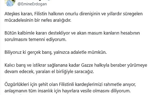 Cumhurbaşkanı Recep Tayyip Erdoğan'ın eşi Emine Erdoğan, Filistin ve İsrail arasında sağlanan ateşkes kararını memnuniyetle karşıladığını belirterek, bu kararın Filistin halkının onurlu direnişi ve yıllardır süregelen mücadelesi için bir nefes aralığı olduğunu ifade etti.Emine Erdoğan, sosyal medya hesabından yaptığı açıklamada, "Ateşkes kararı, Filistin halkının onurlu direnişi ve yıllardır süregelen mücadelesi için bir nefes aralığıdır. Bütün kalbimle kararı destekliyor ve akan masum kanların hesabının sorulmasını temenni ediyorum. Biliyoruz ki gerçek barış, yalnızca adaletle mümkün. Kalıcı barış ve istikrar sağlanana kadar Gazze halkıyla beraber yürümeye devam edecek, yaraları el birliğiyle saracağız. Özgürlükleri için şehit olan Filistinli kardeşlerimizi rahmetle anıyor, anlaşmanın tüm insanlık için hayırlara vesile olmasını diliyorum" dedi.