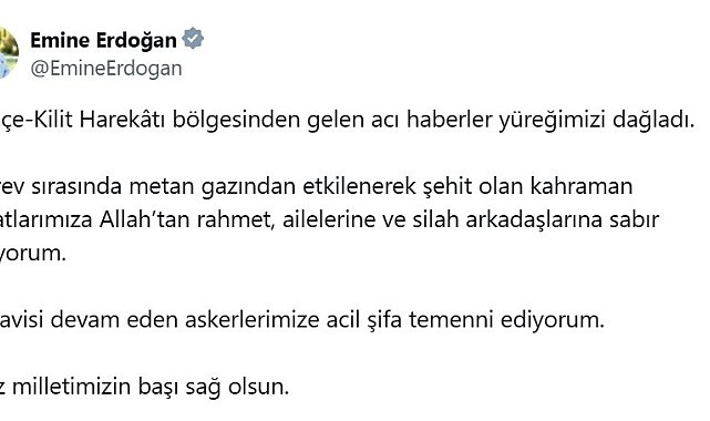 Cumhurbaşkanı Recep Tayyip Erdoğan'ın eşi Emine Erdoğan, Pençe-Kilit Harekat bölgesinde bir mağarada arama-tarama faaliyeti sırasında metan gazına maruz kalarak şehit olan 12 asker için başsağlığı mesajı yayımladı.Emine Erdoğan, sosyal medya hesabından yaptığı paylaşımda, şu ifadeleri kullandı:"Pençe-Kilit Harekatı bölgesinden gelen acı haberler yüreğimizi dağladı. Görev sırasında metan gazından etkilenerek şehit olan kahraman evlatlarımıza Allah'tan rahmet, ailelerine ve silah arkadaşlarına sabır diliyorum. Tedavisi devam eden askerlerimize acil şifa temenni ediyorum. Aziz milletimizin başı sağ olsun."