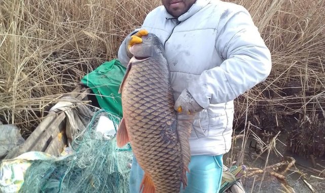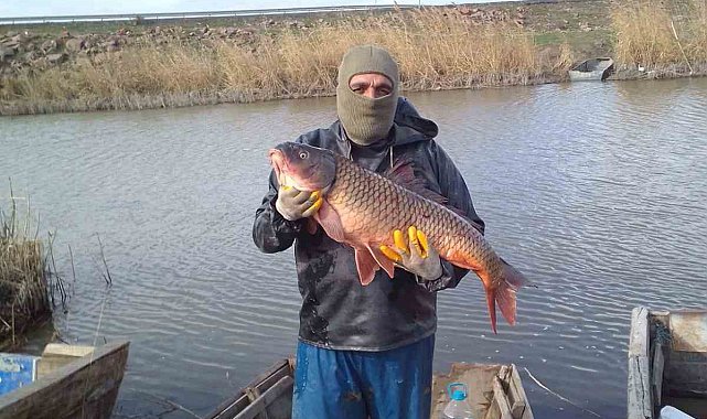 Edirne'nin Enez ilçesindeki Gala Gölü'nde 2 kardeş, attığı ağlar ile 18 kiloluk sazan balığı yakaladı.