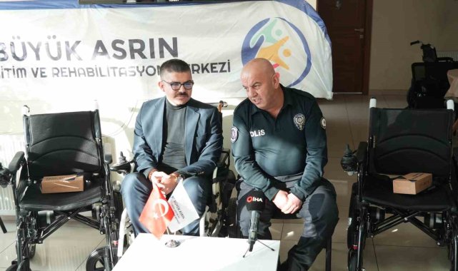Ankara'da polis memuru Mustafa Şahin, bir sivil toplum kuruluşuyla birlikte, 3 Aralık Dünya Engelliler Günü dolayısıyla engelli bireylere akülü sandalye hediye etti.