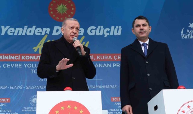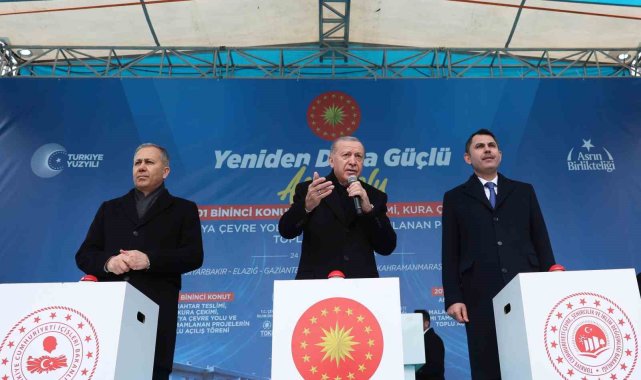 Cumhurbaşkanı Erdoğan, Malatya'da düzenlenen törende depremzedelere 201 bininci konutun anahtarını teslim etti. Erdoğan, 2025 yılı sonuna kadar deprem bölgelerinde toplamda 452 bin 983 bağımsız bölümün hak sahiplerine verileceğini açıkladı.Cumhurbaşkanı Recep Tayyip Erdoğan, Malatya'da düzenlenen törende, depremzedelere 201 bininci konutun anahtarını teslim etti. Erdoğan, bu projelerin, devlet ve millet dayanışmasının en somut örneklerinden biri olduğunu belirtti. Depremzedelerin yaralarını sarmaya devam ettiklerini vurgulayan Erdoğan, yeni konutların hayırlı olmasını diledi ve her bir vatandaşın huzurlu ve güvenli yuvalarında yaşamalarını temenni etti."6 Şubat depremlerinin yaralarını sarmaya devam ediyoruz"Erdoğan, "Bugün Malatya'da, 11 ilimizde yapımı tamamlanan 201 bininci yuvanın anahtarlarını teslim etmenin heyecanını yaşıyoruz. 6 Şubat depremlerinin yaralarını sarmaya devam ediyoruz. Geçtiğimiz Kasım ayında Kahramanmaraş'ta 155 bin yuvanın anahtarlarını teslim etmiştik. Söz verdiğimiz üzere, 2024 yılı sonu itibariyle konutlarımızın yüzde 45'ini tamamlamış durumdayız. Bugün de 201 bin yuvanın anahtarlarını teslim ediyoruz. Bu yuvaların her biri, yeniden daha güçlü bir Anadolu idealimizin bir parçasıdır ve milletimizle olan dayanışmamızın en güzel örneğidir" dedi.İnşa çalışmaları devam ediyorCumhurbaşkanı Erdoğan, depremin ardından başlatılan inşa sürecinde, 11 ilde 174 ayrı alanda bin 900 şantiyede, 182 bin mimar, mühendis ve işçi ile çalışmaların sürdüğünü belirtti. Şu ana kadar 19 bin 750'si Malatya'da olmak üzere toplamda 155 bin 124 konut ve işyerinin hak sahiplerine teslim edildiğini söyleyen Erdoğan, ayrıca, hak sahipleri için inşa edilmesi planlanan konutların tamamının inşasına başlandığını kaydetti."11 ilimizde toplam 201 bin 431 bağımsız bölümü afetzedelerle teslim etmiş oluyoruz"Cumhurbaşkanı Erdoğan, depremzedelere yapılan konut teslimatlarının devam ettiğini belirterek, "Bugün Hatay'da 13 bin 980, Adana'da 2 bin 945, Gaziantep'te bin 535, Diyarbakır'da 822, Elazığ'da 3 bin 353, Adıyaman'da 6 bin 781, Kahramanmaraş'ta 7 bin 202, Şanlıurfa'da 991, Kilis'te 223, Osmaniye'de bin 921 ve Malatya'da 6 bin 554 olmak üzere toplamda 46 bin 307 yuvamızı hak sahipleriyle buluşturuyoruz. Böylece 11 ilimizde toplam 201 bin 431 bağımsız bölümü afetzedelerle teslim etmiş oluyoruz. 2025 yılı sonuna kadar, Malatya'da 68 bin 706 konut ve 10 bin 714 işyeri olmak üzere toplamda 79 bin 420 konut ve iş yerini teslim edeceğiz. Deprem bölgemizde ise 452 bin 983 bağımsız bölümü vatandaşlarımıza teslim etmiş olacağız. İnşallah yıl bitmeden, deprem bölgesindeki 11 ilimizde tüm vatandaşlarımız huzurlu, güvenli yeni yuvalarına kavuşacak, iş yerini açmayan tek bir depremzede kalmayacak" şeklinde konuştu.Malatya'ya önemli yatırımlarCumhurbaşkanı Erdoğan, konut projelerinin yanı sıra, Malatya için önemli bir ulaştırma projesi olan Kuzey Çevre Yolunun yapımının da devam ettiğini açıkladı. Toplam uzunluğu 53,5 kilometre olan Malatya çevre yolunun 3 etap olarak projelendirildiğini belirten Erdoğan, çevre yolunun 38,2 kilometrelik kısmının tamamlandığını ve Sivas kavşağı ile Battalgazi köprülü kavşağı arasındaki 12,1 kilometrelik kesiminin hizmete açıldığını söyledi. Erdoğan, Elazığ-Malatya ayrımı Pütürge kavşağında son bulan 15,3 kilometrelik son kesimin de çalışmalarının da devam ettiğini ifade etti."Emeği olan herkese teşekkür ediyorum"Cumhurbaşkanı Erdoğan, hem konut yapımında hem de yol projelerinin hayata geçirilmesinde emeği geçen bakanlıklar, yüklenici firmalar, mühendisler ve işçilere teşekkür ederek, "Allah yar ve yardımcımız olsun. Hem konutlarımızın yapımında hem de yol projemizin hayata geçirilmesinde emeği olan herkese teşekkür ediyorum. Deprem felaketinde hayatını kaybeden vatandaşlarımıza bir kez daha Cenab-ı Allah'tan rahmet diliyorum. Sizleri bir kez daha saygıyla selamlıyorum, Allah'a emanet olun" diyerek sözlerini sonlandırdı.Konuşmaların ardından deprem bölgesinde yapımı tamamlanan evlerin kura çekimi gerçekleştirildi. Kura çekimi sonrası ise Kuzey çevreyolunun açılışına bağlanan Cumhurbaşkanı Erdoğan, daha sonra tamamlanan evlerin anahtarlarını depremzede ailelere takdim etti. Toplu açılış töreni kurdele kesimi ve dua ile son buldu.