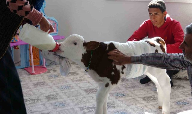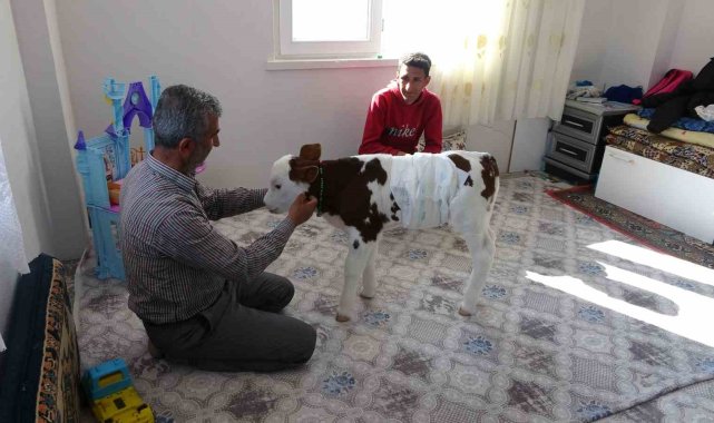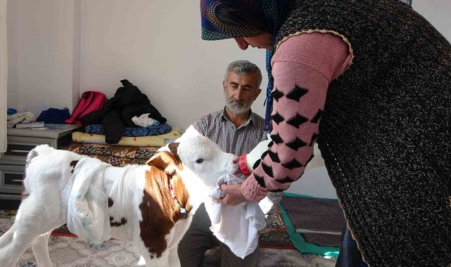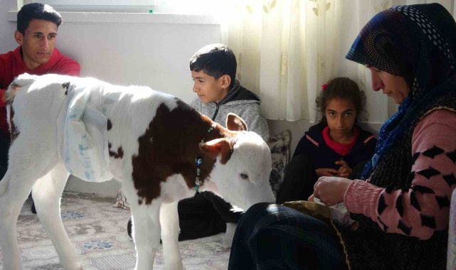Adıyaman'da erken doğan buzağılarına çocukları gibi bakan Coşkun ailesi, buzağıyla aynı odada yatıp kalkıyor.Adıyaman'ın Şerefli Köyü'nde 35 yıldır hayvancılıkla uğraşan 3 çocuk annesi Birgül Coşkun ve Mehmet Coşkun'un ahırda besledikleri ineği erken doğum yaptı. 8 ay 10 günlük olarak doğum yapan ineğin buzağısı halsiz ve bitkin bir şekilde hayata gözlerini açtı. Ölmek üzere olan buzağının annesini emmediğini ve ineğin de oldukça üzüldüğünü fark eden Coşkun Çifti, buzağıyı yaşadıkları eve çıkararak odada beslemeye başladı. Hasta beziyle buzağının altını bağlayan, biberonla karnını doyurmaya çalışan Coşkun Çifti, buzağıyla aynı odada yaşam sürmeye başladı. Buzağıyla 11 gündür ayı odada yaşayan Coşkun ailesi, buzağıya gözleri gibi bakıyor.Sobalı odada ayaklanan ve sağlık durumu her geçen gün daha da iyiye giden buzağı, 3 çocuklu Coşkun ailesinin adeta bir ferdi oldu. Buzağıya çocukları gibi baktıklarını dile getiren Mehmet Coşkun, "İneğin doğumuna 20 gün kala doğum gerçekleşti. Doğum sonrası buzağının durumu iyi değildi. Bizlerde bu nedenle buzağıyı alarak eve getirdik ve odamızda sobanın yanında beslemeye başladık. Birkaç gün sonra buzağı canlanmaya başladı. Önce şırıngayla besledik daha sonra ise biberonla beslemeye başladık. Ayaklandı ve oldukça hareketlendi. 11 gündür aynı odada yaşıyoruz kendisine de çok alıştık. Ailemizin bir ferdi oldu, çocuk gibi bakıyoruz ona" dedi.Birgül Coşkun ise konuşmasında, "Bir çocuğa nasıl bakılıyorsa bende aynen öyle bakıyorum. Gece uyanıp biberon istiyor ve kendisine süt veriyorum. Bezini değiştiriyorum. Biraz oynayıp zıpladıktan sonra yeniden yatırıp uyumasını sağlıyorum. Kendisine çok alıştık ve yeniden ahıra götürmeyi düşünmüyorum" diye konuştu.