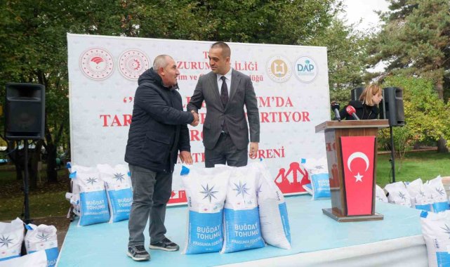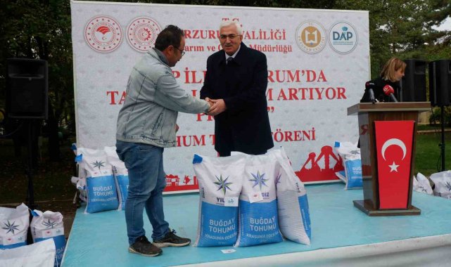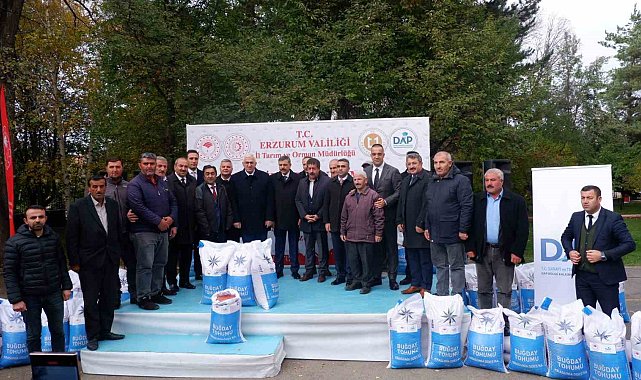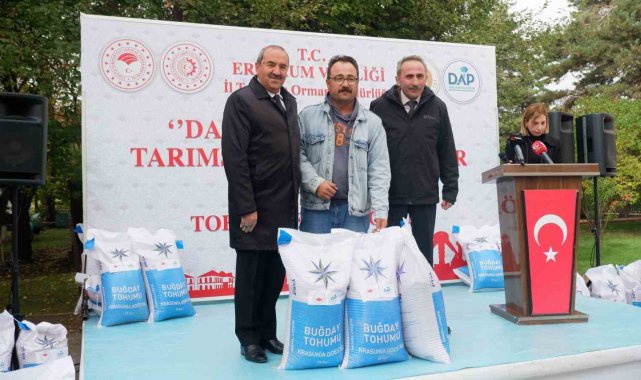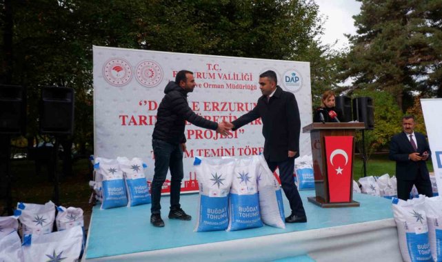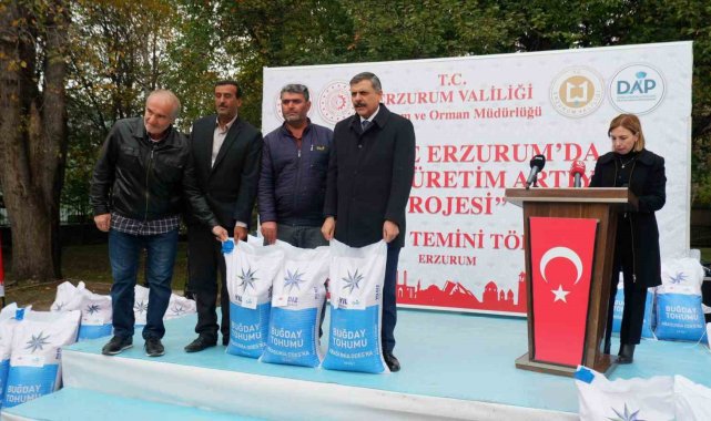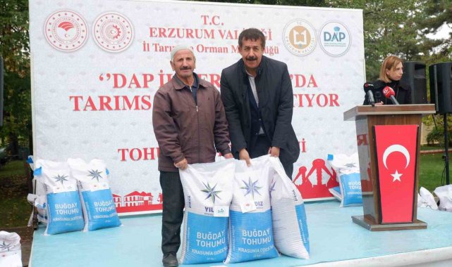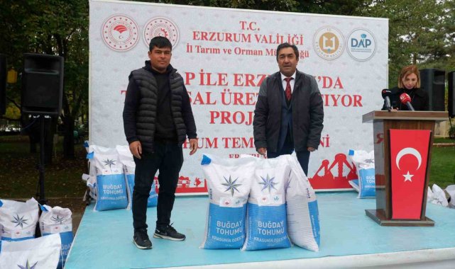 Erzurum'da DAP Başkanlığı'nın destek verdiği "Erzurum'da Tarımsal Üretim Artıyor Projesi" çevresinde bin 870 çiftçiye 935 ton buğday tohumu dağıtıldı.