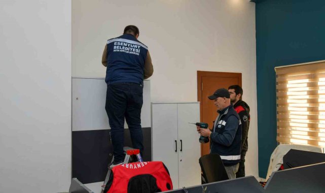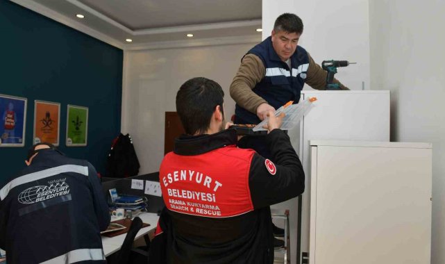 Depreme dirençli bir kent oluşturmak için çalışmalarını sürdüren Esenyurt Belediyesi, kamu kurumlarındaki personele afet bilinci eğitimi veriyor, deprem esnasında tehlike oluşturacak eşyaları sabitliyor.