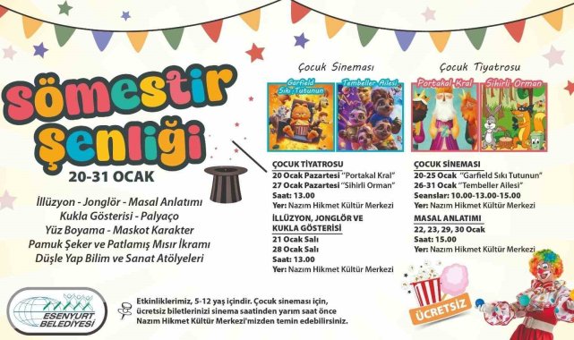 Esenyurt Belediyesi, sömestr tatilinde bilim sanat atölyeleri, spor kursları, tiyatro ve sinema gösterimleri ile birbirinden keyifli aktivitelerin yer aldığı bir dizi etkinlik hazırladı. Çocuklar, zihinsel ve bedensel gelişimlerini destekleyecek bu programda hem gönüllerince eğlenecek hem de yeni eğitim dönemine stressiz bir şekilde başlayacak.Esenyurt'ta 2024-2025 eğitim ve öğretim yılının ilk yarısını tamamlayan öğrenciler için birbirinden eğlenceli ve öğretici bir sömestr programı hazırlandı. Bilim ve sanat atölyeleri, çocuk tiyatroları, sinema gösterimi, masal anlatımı, illüzyon ve kukla gösterilerinin yer aldığı etkinlik takvimine, sağlıklı bir yaşam için spor branşları da eklendi. Çocuklar, zihinsel ve bedensel gelişimlerini destekleyecek etkinlik programında eğlenerek, okulun stresini atacak.Dolu dolu bir program20-31 Ocak tarihleri arasında gerçekleşecek olan etkinliklerde, illüzyon, jonglör, masal anlatımı, kukla gösterisi, palyaço, yüz boyama ve maskot karakterden oluşan bir şenlik düzenlenecek. Çocuk tiyatrolarında Portakal Kral ve Sihirli Orman isimli oyunlar yer alırken, sinema etkinliklerinde ise Garfield Sıkı Tutunun ve Tembeller Ailesi 20-31 Ocak tarihleri arasında Nazım Hikmet Kültür Merkezi'nde gösterimde olacak.Eğitici ve eğlenceli atölyeler çocukları bekliyorBilimin yanında sosyal ve duygusal öğrenmeyi de gerçekleştirmek amacıyla hayata geçirilen Düşle Yap Bilim ve Sanat Atölyeleri, sömestr tatilinde kapılarını açıyor. 8-14 yaş aralığındaki çocuklar için 5 farklı branşta eğitim modelini içeren atölyeler, alanında uzman eğitmenler eşliğinde, çocukların gelişim özelliklerine uygun olarak hazırlandı. Keşfedici bir eğitim modelinin uygulanacağı atölyelerde çalışmalar en az ikişer saatlik dersler ve 20 kişilik gruplar halinde yapılacak. Çocukların eğlenerek öğrenmelerini sağlayan bu programda; Robotik Kodlama, Ritim, Kitap Ayracı, Taş Boyama ve Canlandır Masal Atölyeleri yer alıyor.14 farklı branşta spor eğitimiÖğrencilerin tatilde spor yapabilmeleri için de bir program oluşturuldu. Belediye bünyesindeki tüm spor merkezleri 7-14 yaş arası çocuklara tatil boyunca 14 farklı branşta hizmet verecek. Eğitimlerden faydalanmak isteyen çocuklar, Gençlik ve Spor Hizmetleri Müdürlüğünün 0212 699 51 55 numaralı telefonunu arayarak istedikleri branşa kayıt yaptırabilecek.Sömestr dönemi boyunca gerçekleştirilecek etkinlik programının ayrıntılarına Esenyurt Belediyesinin web sayfasından ve sosyal medya hesaplarından ulaşılabilecek.