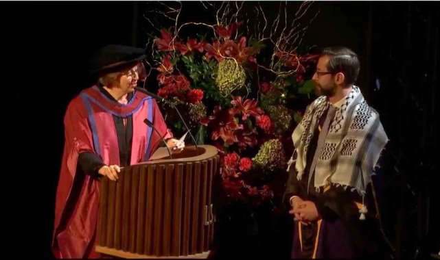 Eski bakanın oğlu Londra'daki mezuniyet töreninde Filistin'e desteğiyle dikkat çekti