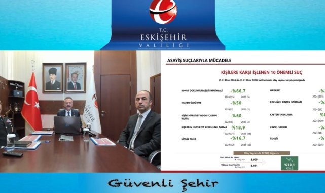 Eskişehir Ekim Ayı Güvenlik Bilgilendirme Toplantısı'nda konuşan Vali Hüseyin Aksoy, "Kişilere karşı işlenen 10 önemli suçta bir önceki yıla göre yüzde 10,1'lik, mal varlığına karşı işlenen 9 önemli suçta ise yüzde 21,4'lük bir azalış gerçekleşmiştir" dedi.