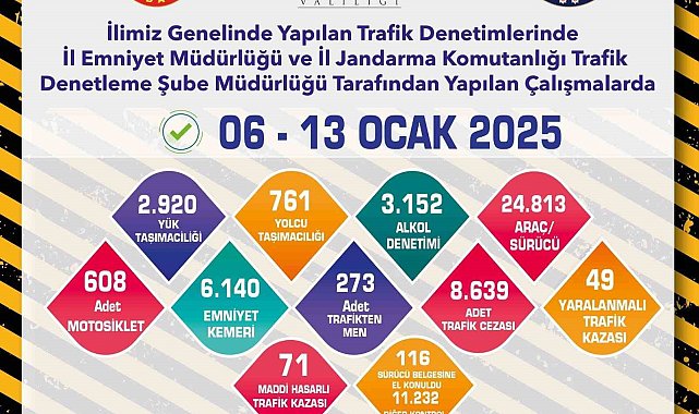 Eskişehir'de polis ve jandarma ekiplerince son 1 hafta içerisinde gerçekleştirilen trafik denetimlerinde 24 bin 813 araç kontrol edilirken, 8 bin 639 adet trafik cezası yazıldığı açıklandı.Edinilen bilgilere göre, Eskişehir İl Emniyet Müdürlüğü ve İl Jandarma komutanlığı Trafik Denetleme Şube Müdürlüğü ekiplerince çalışma yapıldı. İl genelinde 6-13 Ocak 2025 tarihleri arasında yapılan denetimlerde; 2 bin 920 yük taşımacılığı, 761 yolcu taşımacılığı, 3 bin 152 alkol denetimi, 608 motosiklet, 6 bin 140 emniyet kemeri ve 11 bin 232 diğer kontrol türleri gerçekleştirildi. Toplam 24 bin 813 araç ve sürücünün kontrol edildiği çalışmalar sonucunda; 8 bin 639 adet trafik cezası yazılırken, 273 araç trafikten men edildi ve 116 sürücü belgesine el konuldu. Ayrıca, çalışmalar sırasında ekiplerce 49 yaralanmalı ve 71 maddi hasarlı trafik kazasına müdahale edildiği öğrenildi.