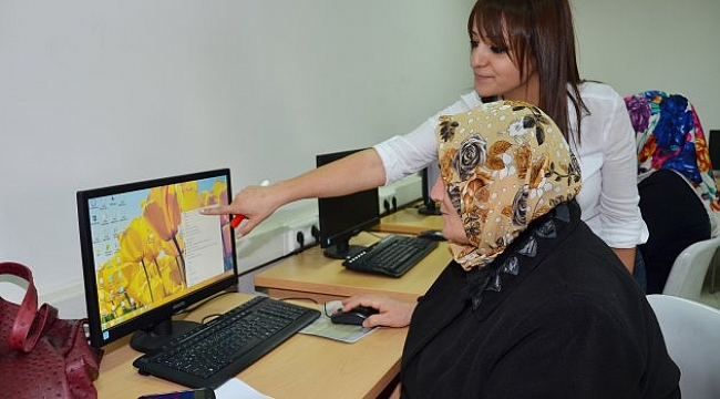Malatya Büyükşehir Belediyesi tarafından Salköprü Semt Konağı'nda açılan bilgisayar i·şletmenliği kursuna kadınlar ilgi gösteriyor.
