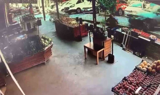 Eyüpsultan'da sürücüsünün direksiyon hakimiyetini kaybettiği otomobil, kaldırıma çıkıp önce park halindeki araca ardından oturan market çalışanına çarptı. Çarpmanın etkisiyle yere düşen şahıs hafif şekilde yaralanırken, adamın ölümden döndüğü kaza anı güvenlik kamerasına yansıdı.