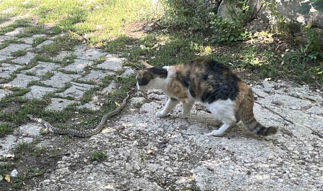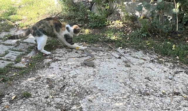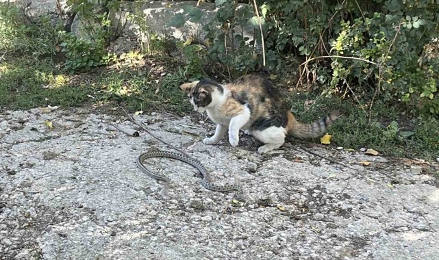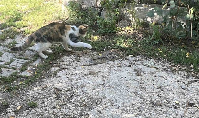 Bayburt'ta bir kediyle yılan arasında yaşanan mücadele cep telefonu kamerasına yansıdı. Fareyle oynar gibi yılanla oynayan kedi, yılana vurduğu pati darbeleriyle yılanı etkisiz hale getirdi.