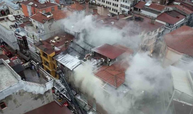Fatih'te 4 katlı iş hanının 2. katındaki terlik deposunda çıkan yangının büyümesinin ardından binadan alevler yükseldi. Yangın itfaiye ekiplerinin yoğun çabaları sonucu kısa sürede kontrol altına alındı. İstanbul Valisi Davut Gül olay yerinde incelemelerde bulunurken, yangını söndürme çalışmaları ise havadan görüntülendi.Edinilen bilgiye göre Fatih Mimar Hayrettin Mahallesi Doğramacı Sokak üzerinde 4 katlı bir iş hanının 2. katındaki terlik deposunda saat 08.00 sıralarında bilinmeyen bir nedenle yangın çıktı. Yangın kısa sürede büyürken, gökyüzü adeta kara bulutlarla kaplandı. İhbar üzerine olay yerine çok sayıda itfaiye ekibi sevk edilirken, tramvay seferleri de durduruldu. Kısa sürede olay yerine ulaşan itfaiye ekipleri alevleri söndürmek için yoğun bir çalışma başlattı. Binada kimyasal madde bulunması üzerine olay yerine gelen AFAD ekipleri de patlamaya karşı önlem aldı.Vali Gül olay yerinde inceleme yaptıİstanbul Valisi Davut Gül ise olay yerine gelerek söndürme çalışmalarıyla ilgili yetkililerden bilgi aldı. Yangın yaklaşık yarım saat süren çalışmaların ardından kontrol altına alınarak soğutma çalışmasına geçildi. İşhanında büyük çapta hasar meydana geldiği öğrenildi. Yangın sebebiyle kapatılan T1 Bağcılar Kabataş - Eminönü hattındaki Çemberlitaş durağındaki seferler ise normale döndü. Öte yandan dumanların yükseldiği binalardaki yangını söndürme çalışmaları havadan görüntülendiŞahin Alan, "Sabahleyin geldim çatıdan dumanlar çıkıyordu. Terlik deposuydu. İtfaiye geldi. Ben tam karşısında çalışıyorum. Alevli yandı" dedi.