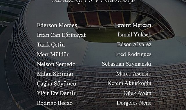 Fenerbahçe'nin, Trendyol Süper Lig'de yarın konuk olacağı Gaziantep FK maçının kamp kadrosu belli oldu. Sarı-lacivertlilerde Jhon Duran da kafilede yer aldı.Fenerbahçe, Trendyol Süper Lig'in 10. haftasında yarın saat 20.00'de deplasmanda Gaziantep FK ile karşılaşacak. Sarı-lacivertliler bu müsabakanın hazırlıklarını tamamlayarak karşılaşma için Gaziantep'e hareket etti. Kanarya'da kamp kadrosu da belli olurken, kafilede Mert Hakan Yandaş ve Bartuğ Elmaz yer almadı.UEFA Avrupa Ligi'nde Stuttgart ile oynanan maçta süre alan Jhon Duran da uzun zaman sonra bir lig maçı için kadroya alındı.Sarı-lacivertlilerin 23 kişilik kamp kadrosunda şu isimler bulunuyor:"Ederson, İrfan Can Eğribayat, Tarık Çetin, Mert Müldür, Nelson Semedo, Milan Skriniar, Çağlar Söyüncü, Yiğit Efe Demir, Rodrigo Becao, Archie Brown, Jayden Oosterwolde, Levent Mercan, İsmail Yüksek, Edson Alvarez, Fred Rodrigues, Sebastian Szymanski, Marco Asensio, Oğuz Aydın, Dorgeles Nene, Kerem Aktürkoğlu, Anderson Talisca, Youssef En-Nesyri ve Jhon Duran."