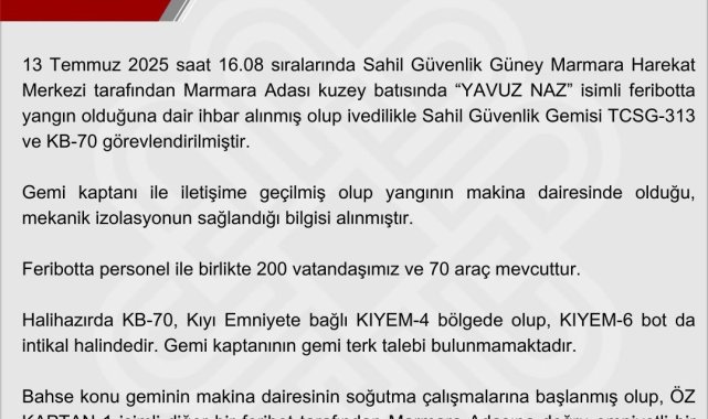 Balıkesir'in Marmara Adası açıklarında makine dairesinde yangın çıkan feribotta soğutma ve tahliye çalışmaları devam ediyor.Balıkesir Valiliği'nden yapılan açıklamaya göre, Marmara Adası açıklarında "Yavuz Naz" isimli feribotun makine dairesinde yangın çıktı. Sahil Güvenlik Güney Marmara Harekat Merkezi koordinesinde bölgeye TCSG-313 ve KB-70 Sahil Güvenlik botlarının ardından Kıyı Emniyeti Genel Müdürlüğü'ne bağlı KIYEM-4 botu da sevk edildi. KIYEM-6 botunun ise intikal halinde olduğu öğrenildi.Gemi kaptanıyla yapılan görüşmede yangının makine dairesinde çıktığı, mekanik izolasyonun sağlandığı bildirildi. Makine dairesinde soğutma çalışmaları devam ederken, "Öz Kaptan 1" isimli feribot tarafından geminin Marmara Adası'na doğru emniyetli şekilde çekildiği ifade edildi.Personel dâhil toplam 200 kişi ve 70 aracın bulunduğu feribottaki vatandaşların tahliye çalışmaları devam ediyor. Gemi kaptanının ise gemiyi terk etme yönünde herhangi bir talebi olmadığı öğrenildi.