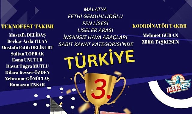 Malatya Fethi Gemuhluoğlu Fen Lisesi öğrencileri, TEKNOFEST 2025 kapsamında düzenlenen Liseler Arası İnsansız Hava Araçları (İHA) Sabit Kanat Kategorisi'nde Türkiye üçüncüsü oldu.