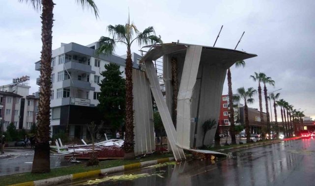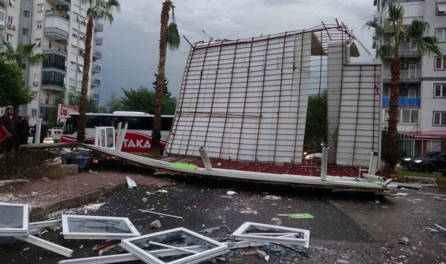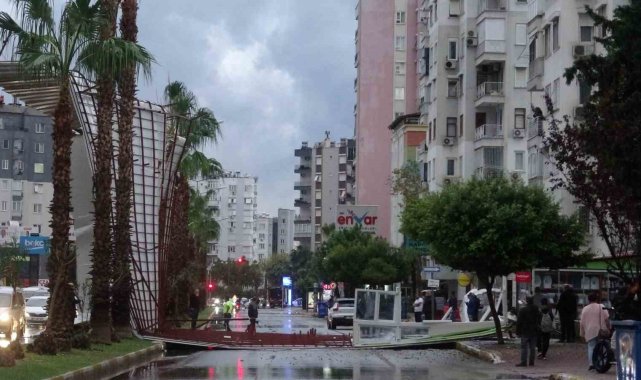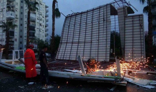 Antalya'da aniden bastıran yağış ve fırtına nedeniyle bir apartmanın çatısı uçtu. Araç trafiğinin en yoğun olduğu saatte şiddetli rüzgara dayanamayan tonlarca ağırlığındaki çatının altında şans eseri herhangi bir araç veya vatandaşın kalmadığı öğrenildi.Antalya'da aniden bastıran ve yarım saat süren şiddetli yağış hayatı felç etti. Birçok noktada şiddetli rüzgar ve fırtına nedeniyle ağaçlar devrilirken. Güllük Caddesi üzerinde bulunan Kent Güvenliği Yönetim Sistemi'ne (KGYS) ait kameraların bulunduğu direk rüzgara dayanamayarak yola devrilip parçalandı. Perge Bulvarı üzerinde ise bir apartmanın çatısı uçtu. Tonlarca ağırlıktaki demir profil ve PVC malzemelerden yapılan çatı nedeniyle yol araç trafiğine kapanırken, olay anında yoldan geçen bir araç veya vatandaş olmadığı öğrenildi. Yola devrilen devasa boyutlardaki çatı nedeniyle yol çift yönlü olarak trafiğe kapatıldı."Büyük bir gürültü koptu"İhbar üzerine olay yerine Antalya Büyükşehir Belediyesi İtfaiye Daire Başkanlığı'na bağlı ekip sevk edildi. Adrese gelen ekipler çatıyı yoldan kaldırmak için kesici aletlerle çalışma başlattı. Olay, anında yakın bir noktada esnaflık yapan Süleyman Çınar isimli vatandaş, "Büyük bir gürültü koptu, çıktığımda apartmanın yukarısındaki çatı çökmüş. Allah'tan aşağıda kimse yoktu. Altında kimse var mı bilmiyoruz, ama en yoğun trafiğin olduğu saatte altında arabanın kalmaması da büyük şans. Şansa yaşıyoruz" dedi.
