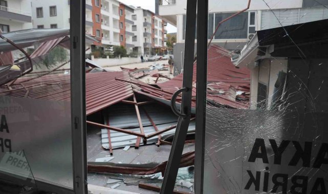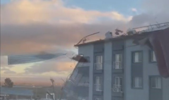 Hatay'da kuvvetli fırtınanın yerinden söktüğü metal çatının kendisine isabet etmesinden koşarak kurtulan vatandaşın ölüme saniyeler kala verdiği mücadele güvenlik kamerasına yansıdı.