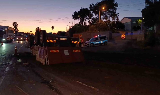 Antalya'da freni patlayan gübre yüklü kamyon Jandarma ve Polisin ortak uygulama noktasına dalarak devrildi. Yol Kontrol Noktasında görevli Jandarma ve Polis ekiplerinin kamyonu erken fark etmeleri sayesinde facianın eşiğinden dönüldü.
