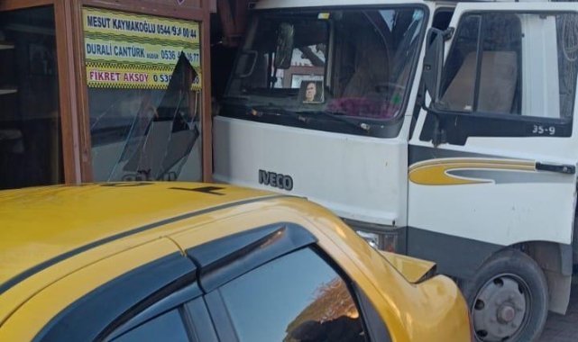 Denizli'de park halinde frenleri boşalan kamyon, taksi durağına girdi.