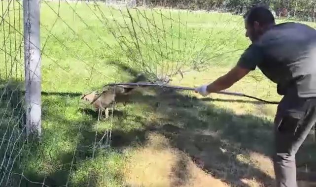 Futbol kalesi filesine sıkışan tilki ekipler tarafından kurtarıldı