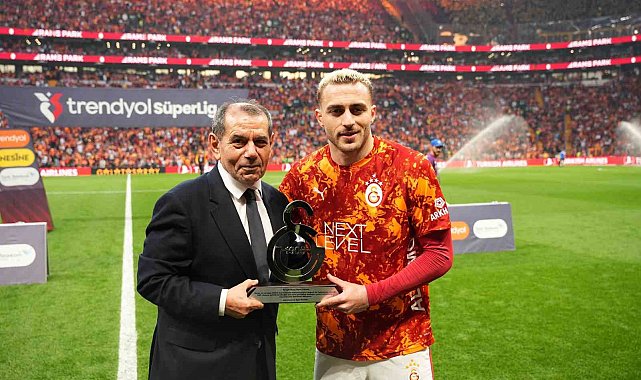 Galatasaray Başkanı Dursun Özbek, sarı-kırmızılılarda 200. maçına çıkan sarı-kırmızılı futbolcu Barış Alper Yılmaz'a plaket ve forma takdim etti.
