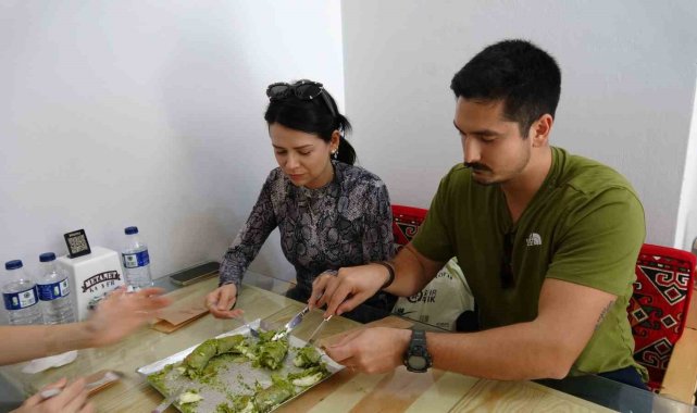Gaziantep'e gelen yerli ve yabancı turistler, kent mutfağında önemli yeri bulunan ve Antep fıstığı ile kaymağın buluştuğu lezzet olan katmeri yemeden gitmiyor. Katmerciler ise turist yoğunluğundan memnun oluyor.Gastronomi şehri Gaziantep'in tescilli lezzetleri arasında yer alan katmer, kentte baklavadan sonra en fazla tüketilen yiyecek olarak tercih ediliyor. Gaziantep'te özellikle kahvaltı sofralarının vazgeçilmezi katmer, turistlerin de tattığı lezzetler arasında ilk sıralarda bulunuyor.Seneler boyunca çeşitli geleneklerin ve kültürlerin harmanlanmasıyla oluşan Gaziantep mutfağının en önemli lezzetlerinden olan katmer, maharetli ellerde tam bir lezzete dönüşüyor.Kültür ve turizm şehri Gaziantep'te turistlerin de tattığı lezzetler arasında ilk sıralarda bulunan katmerin, turistlerin de ilgi göstermesiyle tüketimi artmaya başladı. Gezi için Gaziantep'e gelen yerli ve yabancı turistler, kentin en ünlü yiyeceklerinden katmeri yemeden gitmiyor.Gaziantep mutfağında önemli yeri olan ve kentte yoğun olarak tüketilen katmer, ağızları tatlandırdığı için turistler katmere hayran kalıyor.Antep fıstığı ve kaymağın buluştuğu katmere Gaziantep halkının yanı sıra yerli ve yabancı turistlerin de ilgi gösterdiğini belirten katmer ustası Gültekin Şerif Babacan, Gaziantep'i ziyaret edenlerin tattığı lezzetler arasında yer alan katmerin lezzetinin Antep fıstığı ve kaymağın bir araya gelmesiyle ortaya çıktığını söyledi.Kentte genellikle kahvaltıda tüketilen Antep katmerinin hamurunda buğday ununun kullanıldığını ve Antep katmerine tadını pişirme sırasında eriyerek yufkaya yayılan şekerin verdiğini belirten Babacan, "Gastronomi şehri Gaziantep katmeri en çok tercih edilen lezzetimizdir. Gaziantep'e gelen turistler de katmeri çok tercih ediyor. O yüzden katmer Gaziantep'in geleneksel bir yiyeceği haline geldi. Daha önceleri gelin ve damadın da ilk sabah kahvaltısında yer alan katmer şu an şehrimize gelen turistlerin de çok ilgisini çekiyor. Gaziantep nasıl bir baklavada ön sırada ise şu anda katmerde de ön sıradayız ve bir Gaziantepli olarak bununla gurur duyuyoruz. Şehrimize gelen turistlere de hizmet vermekten onur duyuyoruz. Katmer baklava gibi çok büyük ilgi gördüğü için herkes bu lezzeti tatmak istiyor. Bu güzel lezzeti tadan müşterilerin çoğu memnun kalıyor. Katmer baklava gibi ince hamur, süt kaymağıyla ve fıstıkla yapılır" dedi.Gaziantep'e gelen turistlerin katmer yemeden dönmediklerini belirten Babacan, katmerin yapılışıyla ilgili de bilgi vererek, "Katmer için ince bir hamur açılıyor. Hamur açıldıktan sonra içerisine 'boz fıstık' dediğimiz fıstık ilave edilir. Fıstıktan sonra şeker ve şekerin üzerine de süt kaymağımız, kaymağın da üzerine sadeyağ ekleriz. Sonra taş fırında piştikten sonra da sunum yapılır" ifadelerini kullandı.Katmerin fiyatının 600 TL olduğunu belirten Babacan, usta ellerde lezzete dönüşen katmere artan bu ilgiden de memnun olduklarını sözlerine ekledi.Arkadaşlarıyla birlikte İstanbul'dan Gaziantep'e gezmeye gelen Ebrar Sarıhan, "Bu benim Gaziantep'e üçüncü gelişim. Her geldiğimde katmer yiyorum. Özellikle İstanbul'dan arkadaşlarımı da davet ettim. Gaziantep'in bütün yemekleri çok lezzetli ama özellikle katmer için kesinlikle Gaziantep'e gelindiğinde katmer yemeden gitmemek lazım. Herkese tavsiye ediyoruz. Ben de her geldiğimde kesinlikle katmer yiyorum. Katmer İstanbul'da çok bulabildiğimiz bir lezzet değil. İstanbul'da katmer bulamıyoruz ve Gaziantep katmeri hem çıtır hem fıstıkla birleştiği için çok lezzetli. O yüzden herkese tavsiye ederim" şeklinde konuştu.Gaziantep katmerini çok beğendiğini belirten Hazal Merve ise, "Bodrum'dan geliyoruz ve katmerin meşhur olduğunu duymuştuk. Buraya da denemek için geldik. Gerçekten övüldüğü kadar da varmış. Hepimiz çok memnun kaldık. Çok lezzetli, daha önce yediğimiz hiçbir katmere benzemiyor. Her şey yerinde güzel olduğu gibi katmerin de en lezzetli olduğu yer burasıymış. Denedik ve gördük" diye konuştu.