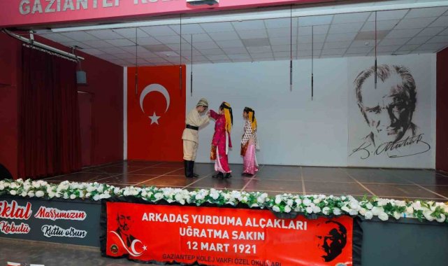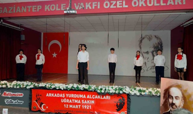 Gaziantep Kolej Vakfı Özel Okulları öğrencileri tarafından sahnelenen ve katılımcıların ayakta alkışladığı oratoryo ve sahne gösterileri büyük ilgi gördü.Gaziantep Kolej Vakfı Özel Okulları Konferans Salonunda düzenlenen ve GKV Özel Ortaokulu öğrencileri tarafından hazırlanan "12 Mart İstiklal Marşı'nın Kabulü ve Mehmet Akif Ersoy'u Anma" törenine, Gaziantep Kolej Vakfı Mütevelli ve Yönetim Kurulu Başkanı Esra İbanoğlu, GKV Mütevelli ve Yönetim Kurulu Üyeleri, Gaziantep Kolej Vakfı Özel Okulları Genel Müdürü Fevzi Gürsel, idareci, öğretmen ve öğrencilerin yanı sıra çok sayıda davetli katıldı.Etkinlik kapsamında saygı duruşu ve İstiklal Marşı'nın ardından GKV Özel Ortaokulu Müdürü Seçil Güldemet'in konuşması ile başlayan tören, İstiklal Marşı'nın kabul sürecini anlatan belgesel ile devam etti. GKV Özel Ortaokulu öğrencilerinin seslendirdiği "Bayrak" şiiri ve oratoryo, ardından "Allı Turnam" türküsünün hikayesi ve müzik öğretmenimiz Ahmet Can Çeteci'nin türküyü seslendirmesi, GKV Özel Ortaokulu öğrencimizin sergilediği dans gösterisi ve ardından drama gösterisi ile devam edildi. Son olarak GKV Öğrenci Korosunun seslendirdiği marşlar ile tören sona erdi. Etkinliğin organizasyonunu gerçekleştiren öğrenci ve öğretmenleri kutlayan Gaziantep Kolej Vakfı Mütevelli ve Yönetim Kurulu Başkanı Prof. Dr. Esra İbanoğlu öğrencilerle de uzun uzun sohbet etti.