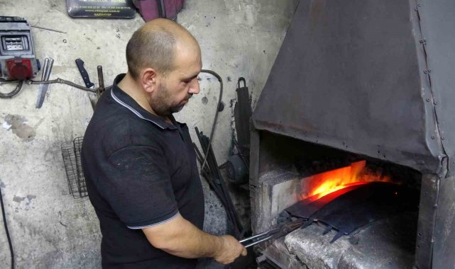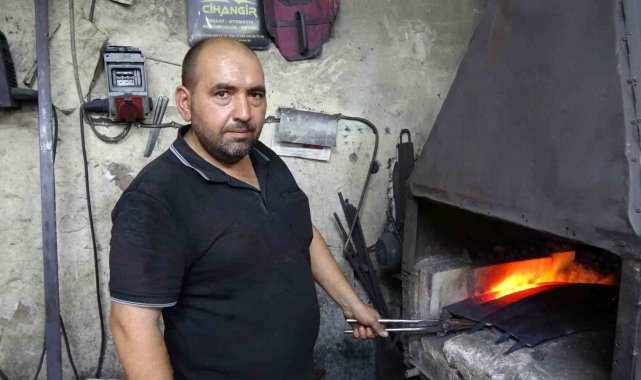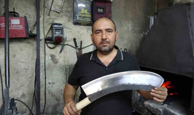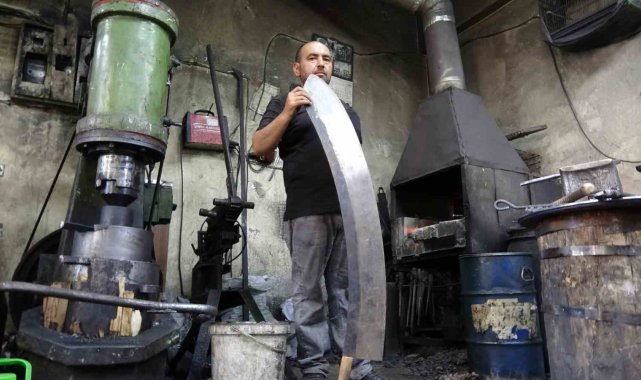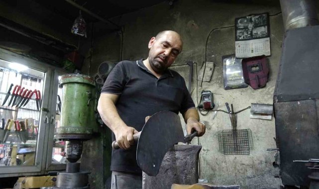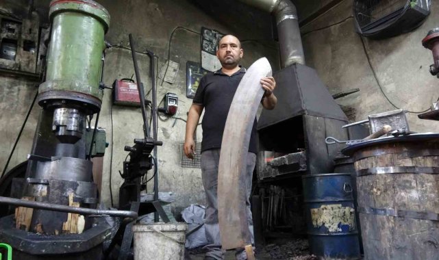 Gaziantep'te bıçak ustasının yaptığı dev et satırı, 60 bin TL'ye alıcısını bekliyor.Tarihi Bakırcılar Çarşısı'ndaki dükkanında çapa, dahre, kazma, bıçak, satır ve balta gibi aletler üreten 44 yaşındaki Erhan Kaz, yaklaşık bir hafta süren çalışmanın ardından şap sapıyla birlikte 1 metre 50 santimetre uzunluğunda dev bir dövme et satırı yaptı. Çarşıda satışa sunulan dev et satırı, görenlerin yoğun ilgisini çekiyor. Et satırının boyunu gören kadar fiyatını öğrenen de şaşırıyor. 60 bin TL'den alıcısını bekleyen et satırı genelde kasaplar için süs amaçlı tercih ediliyor.Babasından öğrendiği demircilik mesleğini 35 yıldır sürdürüyorBabasından öğrendiği demircilik mesleğini 35 yıldır severek sürdüren Erhan Kaz, çocuk yaşta öğrendiği demircilikte yıllardır kızgın demire çekiç sallıyor. Henüz 10 yaşındayken babasının yanında çıraklık yapmaya başlayan ve ilkokulu bitirdikten sonra da babasının yanında çalışmaya başlayan ve babasından mesleğin tüm inceliklerini de öğrenerek yıllarca çeşitli ürünler yapan Kaz, son yıllarda sayıları bir elin parmaklarını geçmeyecek kadar azalan ender ustalar arasına girdi. 7 yıl öncesine kadar babası ve ağabeyiyle birlikte çalışan Kaz, kendi iş yerinde günde 10 saate yakın çalışıyor. Dedesinden babasına geçen demircilik mesleğini aynı özveriyle sürdüren Kaz, geçen 35 yılda da çok sayıda eleman yetiştirdi.Demir parçalarını çekiçle döverek kazma, kürek, satır ve bıçak gibi aletlere dönüştürüyorMakasla kesip, ocakta erittiği demir parçalarını çekiçle döverek kazma, kürek, nacak, balta, kürek, satır ve bıçak gibi aletlere dönüştüren usta, mütevazı atölyesinde demire şekil vermeyi sürdürüyor. 35 yıldır ateşte demir döven ve meslek hikayesini ise bugünlere kadar taşıyan Kaz, mesleğini ilk günkü aşkla devam ettiriyor.Bir haftada yaptığı insan boyundaki et sarını 60 bin TL'ye satıyorİnsan boyundaki et satırıyla ilgili bilgi veren Kaz, "Bu et satırını yaklaşık bir hafta sürede yaptım. 1 metre 50 santimetre uzunluğunda yaptığım dev et satırını iş yerimin cam vitrinine koymak için ve deneme amaçlı yaptım. Fiyatı 60 bin TL'dir" dedi."35 yıldır bu mesleği yapıyorum"Mesleğiyle ilgili de bilgi veren Kaz, ilkokul yıllarında tatil günlerinin yanı sıra okula gittiği günlerde dersten çıkıp babasının yanında çırak olarak çalışmaya başladığını belirterek, "Bu mesleğe ilkokula giderken, baba mesleğimiz olduğu için okul tatillerinde babamızın dükkanına gider, orada çalışırdık. O tarihten bu yana bu mesleğin içindeyiz. Bu mesleğe giren kişi önce kömür kırmadan başlar. Kömür kırmayı öğrendikten sonra çekiç vurmaya geçersin. İlerleyen yıllarda kalfa olur, usta olur ve devam edersin. 15-16 yaşından bu yana bu meslekte çekiç sallıyorum. Demiri parlatmasını ve diğer işlemlerin hepsini yapabiliyordum. Sadece dövme yapamıyordum. Bu meslekte en önemli olan kısım kıskacı tutabilmek. Kıskacı tuttuktan sonra her şeyi yaparsın. Kendi iş yerimi yaklaşık 7 sene önce açtım. 7 seneden beri kendi iş yerimi çalıştırıyorum. 7 sene öncesine kadar da babamla ve ağabeyimle beraber çalışıyorduk. 35 yıldır bu mesleği yapıyorum. İşimiz genelde tehlikeli bir iştir. Çünkü bıçakla uğraşıyoruz. Keskinlik var, elini ve ayağını kesebilirsin. Mesleğimiz tehlikeli bir meslek. Tabi ki yazın günü sıcakta çalışıyoruz. Hava bayağı aşırı sıcak oluyor. Kışında terliyoruz, hava soğuk olduğundan dolayı bir sıcak bir soğuk derken de hasta oluyoruz. Yani kolay bir meslek değil" dedi."Sabah başlayıp öğlene kadar çekiç vuruyoruz"Çapa, balta, kazma, tırmık, bıçak, satır ve dahre gibi aletlerin hem tamirini hem de üretimini yaptığını belirten Kaz, "Sabah başlayıp öğlen 12.00'a kadar bu çekici vuruyoruz. Seri ve hızlı bir şekilde demire vurduğumuz için çekiç sayısını saymamız mümkün değil. Mesleğimiz kolay değil. Normal bir çelik malzemeyi bıçağa, et zırhına ve baklava dilim bıçağına döndürüyoruz. Demire model veriyoruz. Bir de yapmış olduğumuz ürünlerin hepsi tamamen dövmedir. Dövme olmayan ürün dükkanımızdan çıkmaz" diye konuştu.