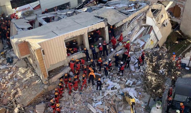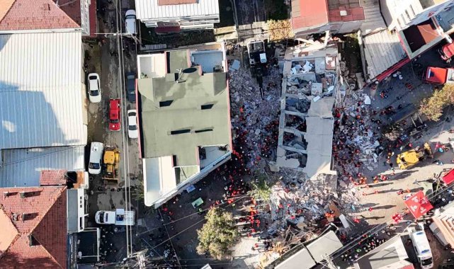 Kocaeli'nin Gebze ilçesinde çöken 6 katlı binanın enkazı ve ekiplerin arama kurtarma çalışmaları dron ile havadan görüntülendi.
