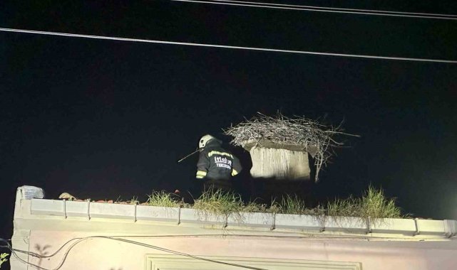 Tekirdağ'ın Muratlı ilçesinde gece saatlerinde çıkan yangın paniğe sebep olurken, evde uyuyan bir kişi itfaiye ekipleri tarafından kurtarıldı.Muratlı ilçesi Kazımdirik-Turan Mahallesi 21. Sokak üzerinde bulunan iki katlı bir binanın ikinci katında başlayan yangın kısa sürede büyüyerek çatıya sıçradı. Alevlerin yükseldiğini fark eden çevre sakinlerinin ihbarı üzerine olay yerine itfaiye, emniyet, sağlık ve TREDAŞ ekipleri sevk edildi. İki itfaiye aracı ve çok sayıda itfaiye personelinin müdahale ettiği yangında, can kaybı yaşanmazken, dumandan etkilenen bir kişi itfaiye ekipleri tarafından kurtarıldı. Şahsın sağlık durumunun iyi olduğu öğrenildi.Çatıdaki leylek yuvası taşındaYangın çıktığı evin çatısında bulunan leylek yuvası da itfaiye ekiplerinin hassas müdahalesiyle zarar görmeden yan alana taşındı. Ekiplerin bu duyarlı çalışması çevredeki vatandaşların takdirini topladı. Yangının kontrol altına alınmasının ardından söndürme ve soğutma çalışmaları başlatılırken, olayla ilgili inceleme sürüyor.