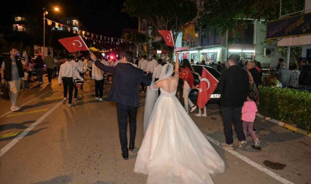 Antalya'nın Demre ilçesinde gece fener alayına katılan gelinle damat, ardından düğün salonuna geçip nikahlarını kıydırdı.Demre'de dün akşam Cumhuriyet'in 102. yıl dönümü kutlamaları çerçevesinde düzenlenen fener alayında sıradışı görüntüler yaşandı. Ellerinde bayraklar ve meşalelerle vatandaşlar, bayram coşkusunu Demre sokaklarına taşıdı. Düğünleri olan Gülsüm Görgülü ve Bayram Kıvrak çifti ise, gelinliği ve damatlığıyla Cumhuriyet coşkusunu paylaşmak için yürüyüşe katıldı. Vatandaşların ve izleyicilerin ilgisini çeken çift, Cumhuriyet Meydanı'ndan başlayıp Noel Baba Meydanı'nda son bulan kortej boyunca halkla birlikte yürüdü. Fener alayının ardından çift, düğün salonuna geçip nikahlarını kıydırdı.