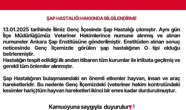 Bingöl'ün Genç ilçesinde şap hastalığı nedeniyle 21 gün süreyle karantina uygulaması başlatıldığı bildirildi.Bingöl İl Tarım ve Orman Müdürlüğü'nden yapılan açıklamada, "13 Ocak 2025 tarihinde ilimiz Genç ilçesinde şap hastalığı çıkmıştır. Aynı gün İlçe Müdürlüğümüz veteriner hekimlerince numune alınmış ve alınan numuneler Ankara Şap Enstitüsüne gönderilmiştir. Enstitüden alınan sonuç neticesinde Genç ilçemizde görülen şap hastalığının O tipi olduğu belirlenmiştir. Hastalığın tespit edildiği ilk andan itibaren tüm kurumlar ile irtibata geçilmiş ve gerekli tüm önlemler alınmıştır. Şap hastalığının en büyük belirtileri ağızda salya, ağız, dil ve ayaklarda oluşan yaralardır. Şap hastalığının bulaşmasındaki en önemli etkenler hayvan, insan ve araç hareketleridir. Bu nedenle Genç ilçemizdeki (veteriner hekim kontrolündeki kesimler hariç) tüm hayvan hareketleri ikinci bir emre kadar durdurulmuştur. Kesime gönderilen hayvanlar için her türlü temizlik ve dezenfeksiyon işlemleri kesimhaneyi de kapsayacak şekilde başlatılmıştır. Alınan sıkı tedbirler sonucunda hastalık çıktığı bölgede kontrol altına alınmış, ilimizde an itibarıyla başka bir bölgeye bulaşması engellenmiştir. Bu nedenle yetiştiricilerimizin panik yapmadan işletmelerine yabancı kişileri sokmamaları, kendilerinin de başka işletmelere girip çıkmamaları, hayvan alım-satımını durdurmaları veya alacaklarsa yeni aldıkları hayvanlarını diğer hayvanlarının içine katmadan en az 21 gün başka bir bölmede karantinada tutmaları, 21 gün sonunda hastalık belirtisi göstermedikleri takdirde hayvanlarının içine katmaları, ahır girişlerinde dezenfektan veya sönmemiş kireç bulundurmaları ve aşılama için gelen veteriner hekimlere yardımcı olup tüm hayvanlarını mutlaka aşılatmaları büyük önem arz etmektedir" denildi.Açıklamanın devamında şu ifadelere yer verildi:"Şap hastalığı viral bir hastalık olduğundan direkt hastalığı iyileştiren bir ilaç yoktur. Hastalık ile ilgili en önemli mücadele yöntemi hareketlerin azaltılması, temizlik ve dezenfeksiyon işlemidir. Hastalık 2 yaşın altındaki hayvanlarda zaman zaman öldürücü olabilmektedir. Son günlerde gerek sözlü olarak ve gerekse bazı sosyal medya hesaplarından 'Şap hastalığı iyileştiren ilaç var. Bu ilacı kullanırsanız hayvan yemeye başlar. Bu hastalık şap değil şu ilaçları kullanın' benzeri söylemler ile yetiştiricimize ilaç satmak isteyen kişiler tespit edilmiştir. Bu kişilere kesinlikle itibar edilmemesi gerekmektedir. Konu ile ilgili olarak tarafımızca bu kişiler tespit edilip, gerekli yasal tedbirler alınmaktadır. Şap hastalığının bilinen en iyi tedavi yöntemleri yukarıda belirtilmiştir. Bunun dışında yapılacak müdahaleler hem hastalığın yayılmamasına, hem hayvanınıza ve hem de yetiştiricilerimizin ekonomisine zarar verecektir. Lütfen bu tür durumlarda İl/İlçe Tarım ve Orman Müdürlüklerimize başvurunuz. Şap hastalığı ile ilgili aşılamalarımız devam etmekte olup, yapılan program çerçevesinde tüm il, ilçe, köylerimizde bulunan büyükbaş hayvanlar aşılanacaktır. Şap hastalığı insanlara bulaşmayan ancak hayvanlara zarar verdiğinden ülke ekonomisine olumsuz etkileri olan viral bir hastalıktır. Hastalığa yakalanan hayvanların sütü bulunduğu yerden dışarı çıkarılmamak kaydıyla çok iyi şekilde kaynatılarak insan beslenmesinde kullanılabilir."