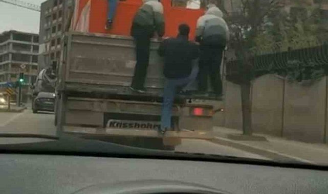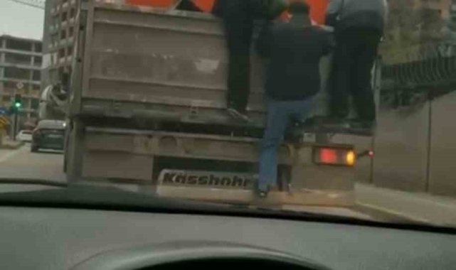 Bursa'da 3 genç, kamyonun arkasında canlarını hiçe sayarak seyahat etti. O anlar kameraya anbean yansıdı.Olay, merkez Osmangazi ilçesinde meydana geldi. Sürücüsü ve plakası henüz öğrenilemeyen kamyonun arkasına 3 genç kaçak bindi. Canlarını hiçe sayan gençler, kamyonun arkasında seyahat etmeye başladı. Tehlikeli anlar, saniye saniye amatör kameraya yansıdı.