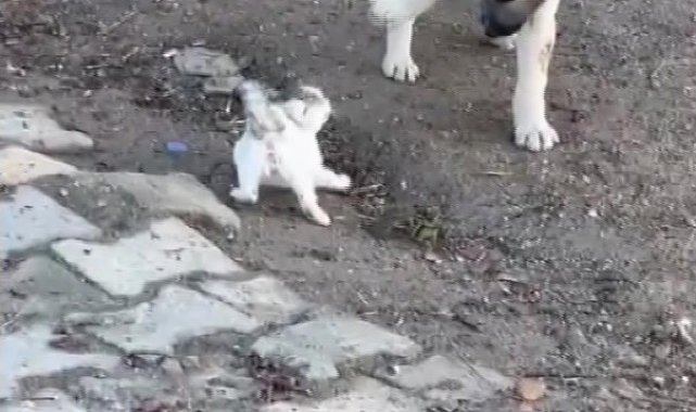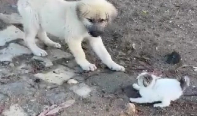 Batman'ın Gercüş ilçesinde yavru kedi ile yavru köpeğin sevimli kavgaları cep telefonu kamerasına yansıdı.