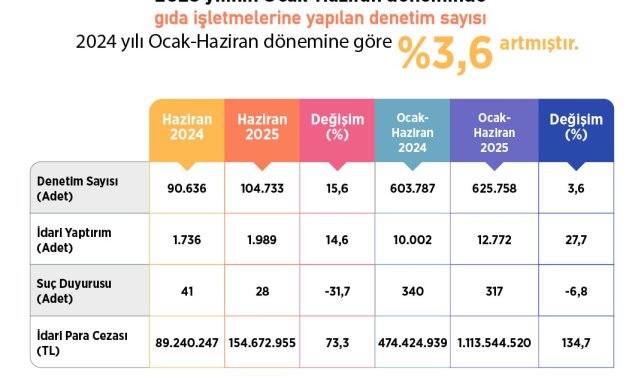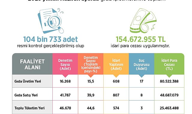 Tarım ve Orman Bakanlığı Gıda ve Kontrol Genel Müdürlüğü, 104 bin 733 gıda işletmesinde denetim yapıldığını ve bin 989'una idari yaptırım uygulandığını açıkladı.Tarım ve Orman Bakanlığı Gıda ve Kontrol Genel Müdürlüğü, sosyal medya hesabından 2025 yılı haziran ayı gıda işletmeleri yurt içi denetim sonuçları ile ilgili paylaşımda bulundu. Gıda ve Kontrol Genel Müdürlüğü, 104 bin 733 gıda işletmesinde denetim yapıldığını ve bin 989'una idari yaptırım uygulandığını duyurdu. Aynı zamanda toplam 154 milyon 672 bin 955 lira idari para cezası verildiğini açıkladı.Gıda ve Kontrol Genel Müdürlüğünden yapılan paylaşımda şu ifadelere yer verdi:"104 bin 733 gıda işletmesinde denetim yapıldı. Bin 989 idari yaptırım uygulandı. Toplamda 154 milyon 672 bin 955 lira idari para cezası uygulandı. 28 gıda işletmecisi hakkında Cumhuriyet Savcılığı'na suç duyurusunda bulunuldu. Vatandaşlarımızın güvenilir gıdaya erişimi için denetimler kararlılıkla sürdürülmektedir."