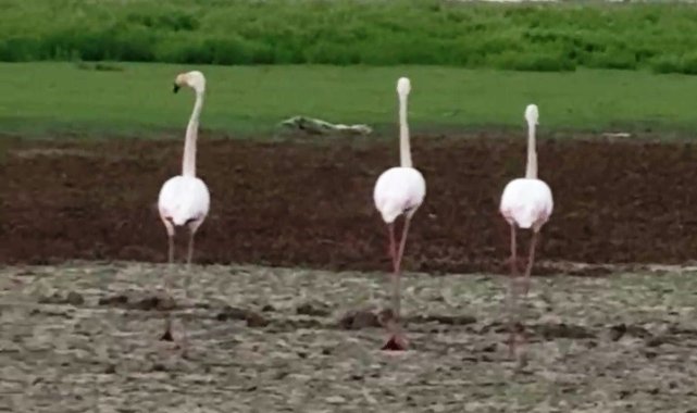 Diyarbakır'ın Çınar ilçesinde göç yolunda olan flamingolar sulak alanda mola verdi.Çınar ilçesinin Bozçalı Mahallesi'nde göç yolundaki flamingolar sulak alanda mola verdi. Bir vatandaşın kamerasına flamingoların gölette mola verdiği anlar yansıdı. Flamingolar daha sonra göletten ayrıldı.