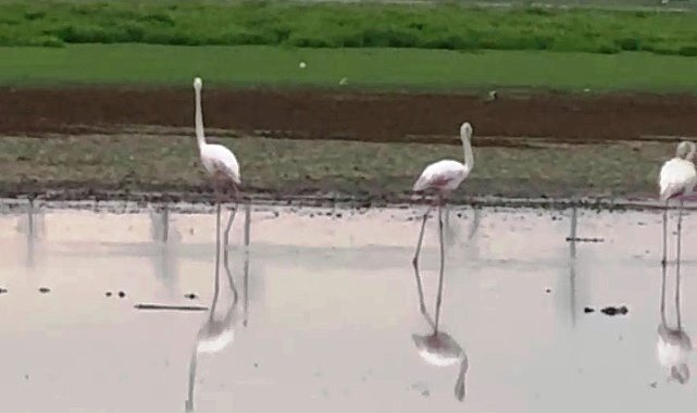 Diyarbakır'ın Çınar ilçesinde göç yolunda olan flamingolar sulak alanda mola verdi.