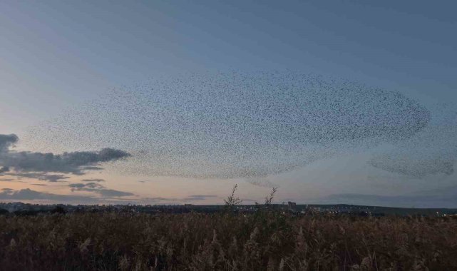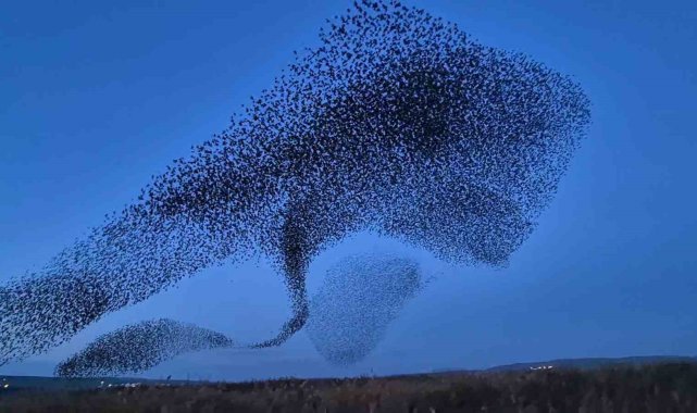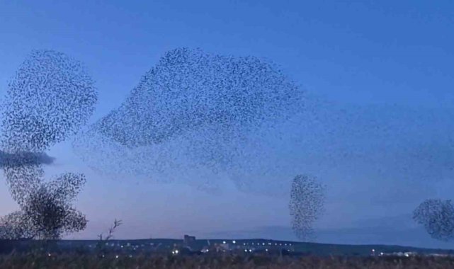 Tekirdağ Süleymanpaşa'da akşam saatlerinde yüz binlerce sığırcığın gökyüzünde oluşturduğu senkronize uçuş izleyenlere muhteşem anlar yaşattı.