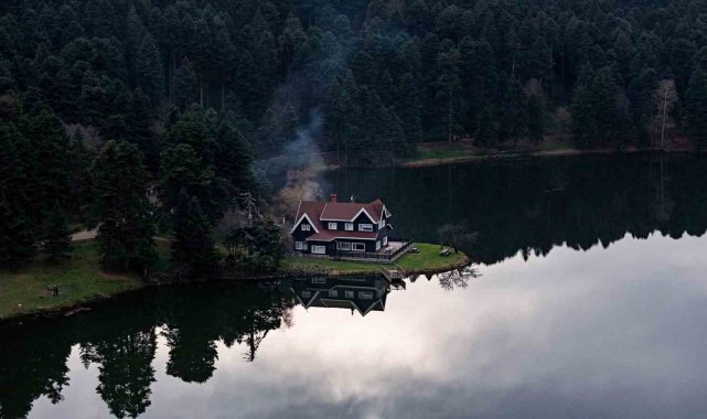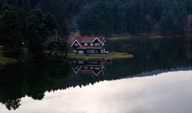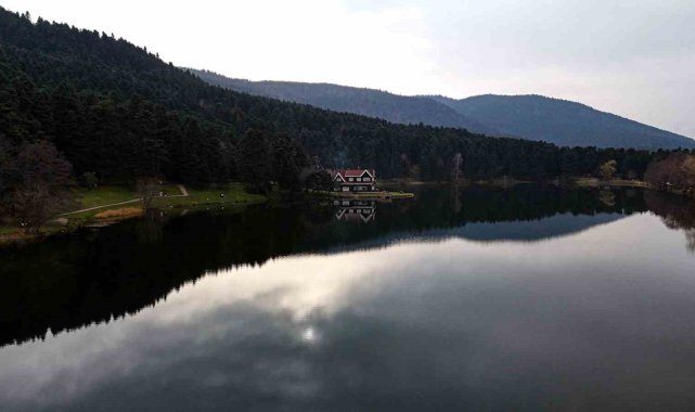 Bolu'nun doğa harikası Gölcük Tabiat Parkı, hafta sonunda ziyaretçi akınına uğradı. Gölün ortasında yer alan simge ev, gölün durgun suyunda yansımasıyla birlikte kartpostallık manzaralar oluşturdu.