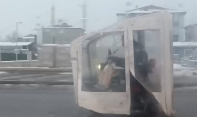 Malatya'da elektrikli motosikletini gardırobu andıran brandalarla kaplayan sürücü, görenleri şaşkına çevirdi. İlginç görüntüler, Yeşilçam klasiği Sakar Şakir filmindeki "yürüyen dolap" sahnesini akıllara getirdi.